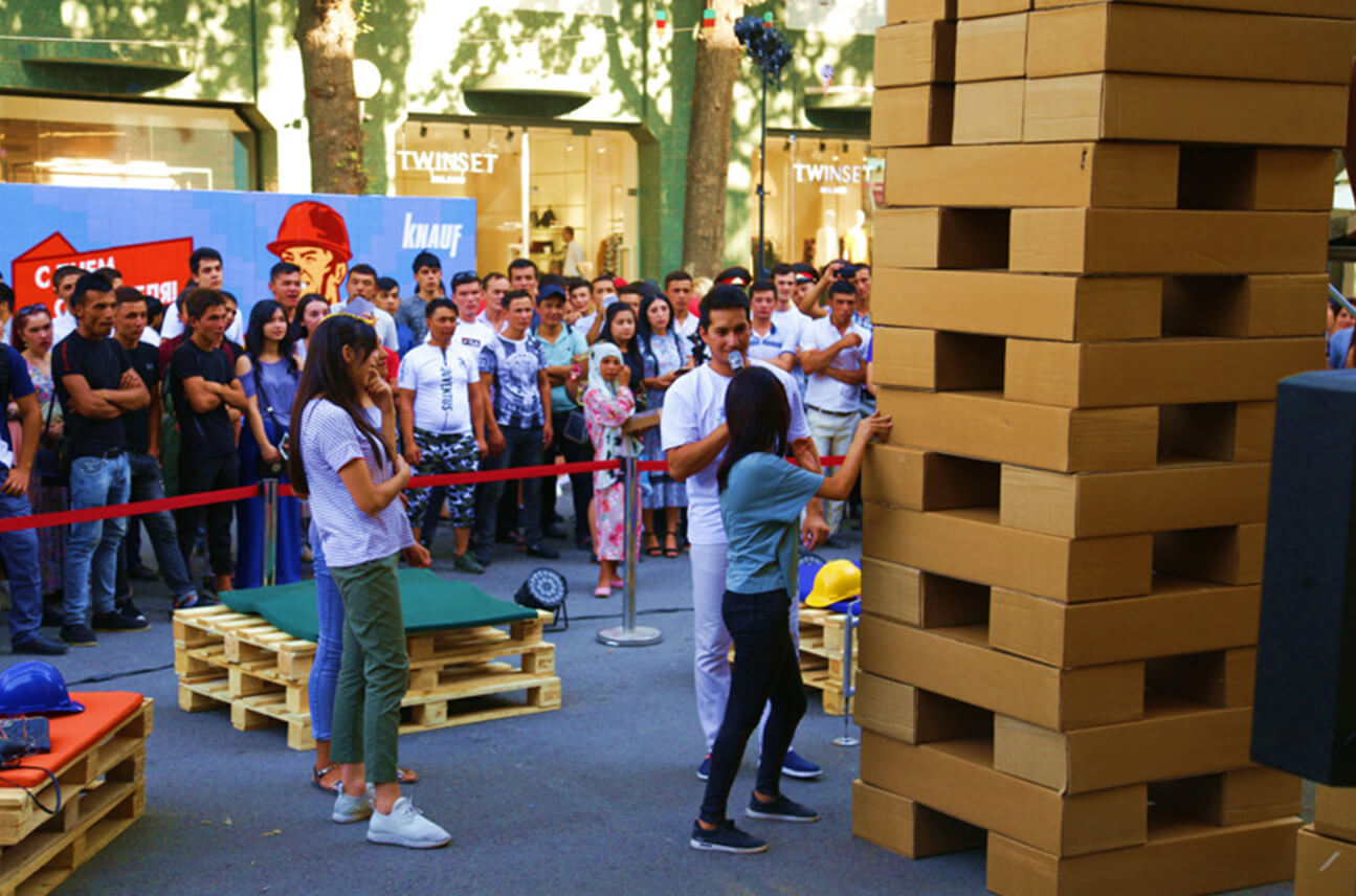 Капитаны команд и их помощники соревнуются в игре Гигантская Дженга.
